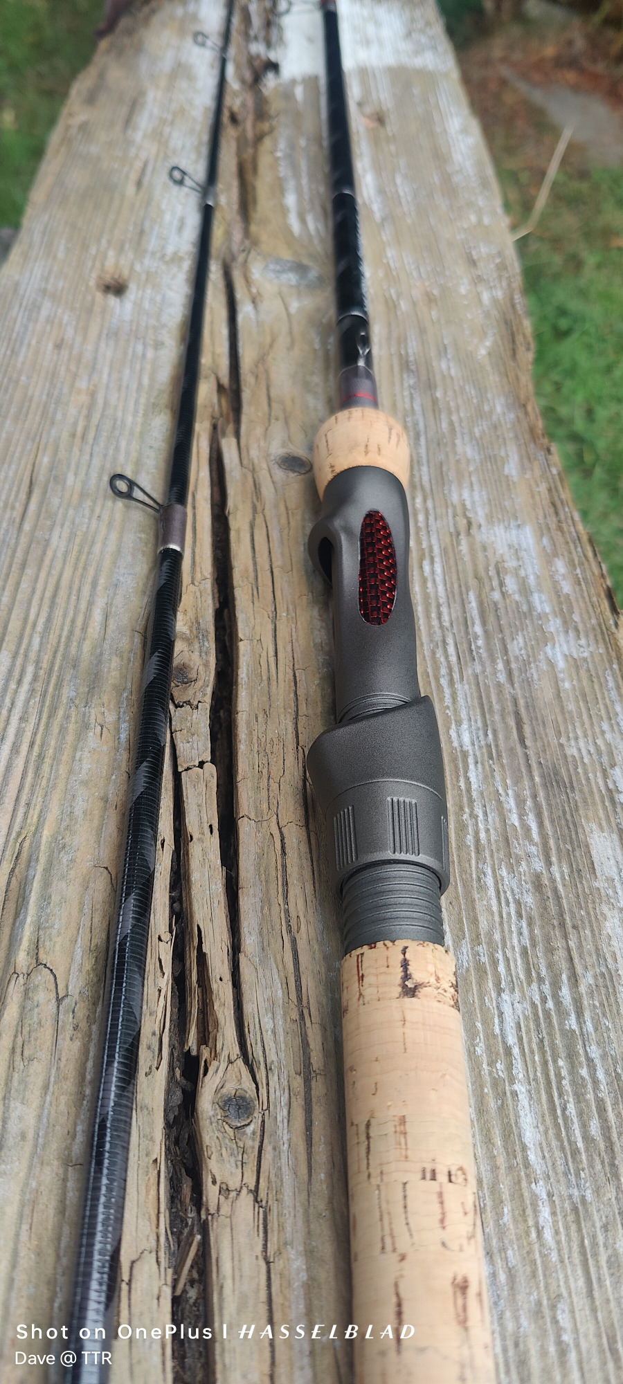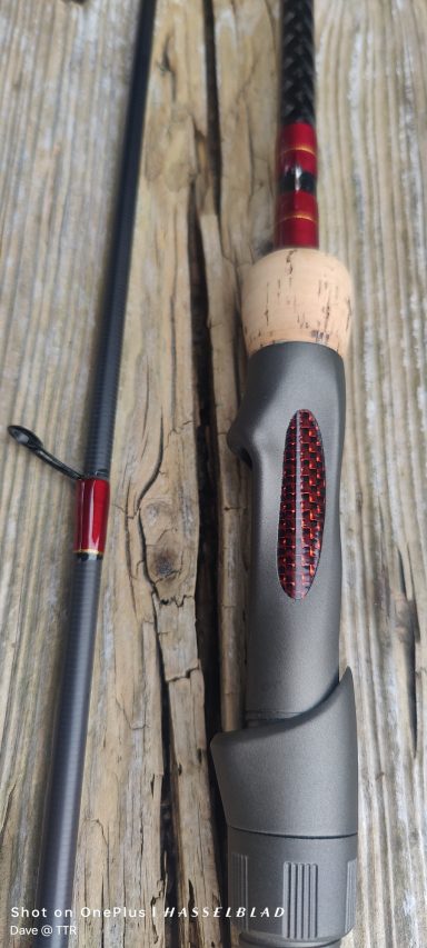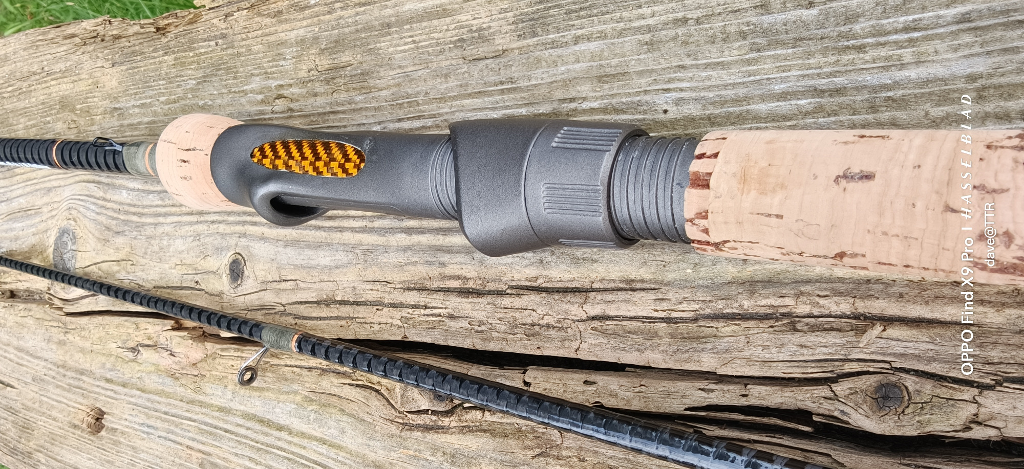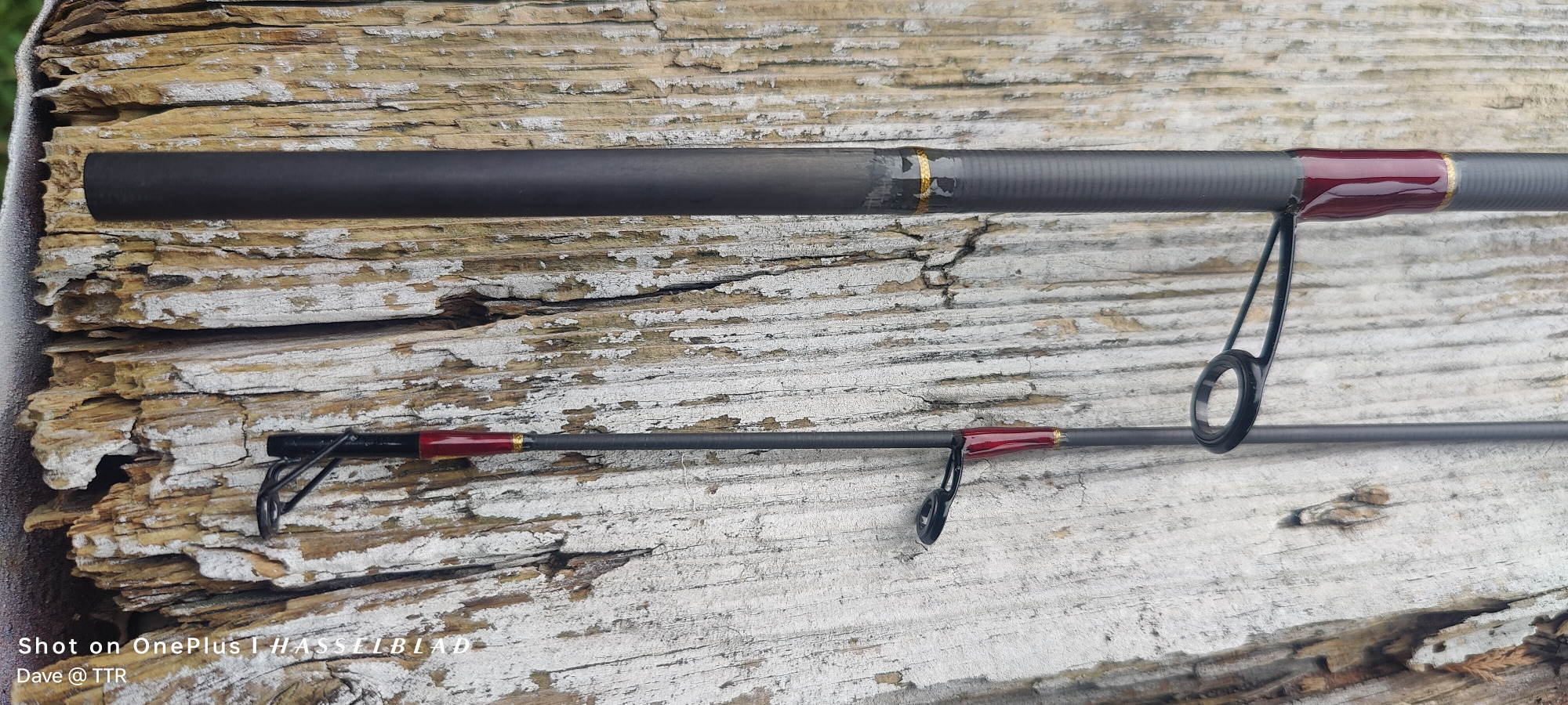The rings start at a generous 12mm O.D butt ring, and intermediates are graded from 8mm to 5mm down the blank to a 5mm O.D threaded swingtip top ring. The full cork handle is complimented by a 17mm TVS type reel seat, with matching carbon fiber inlay, for a comfortable, stylish finish, and will take virtually any reel you would want to pair with it. The top of the handle is finished with a Gold aluminium trim ring, and the bottom is finished with a matching Gold aluminium butt cap.